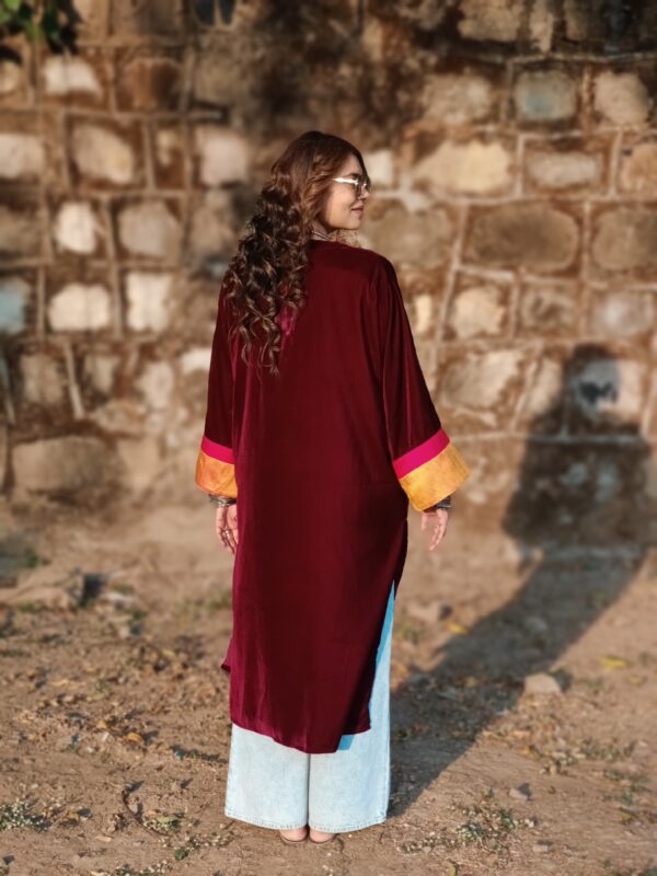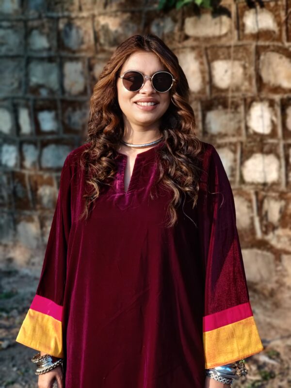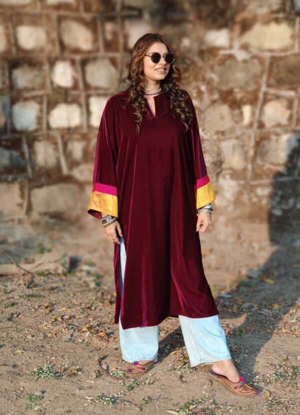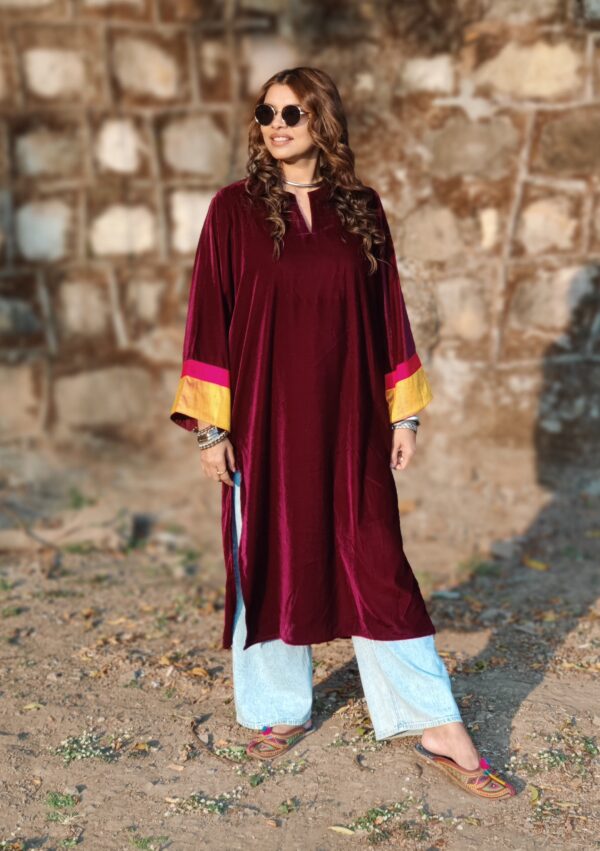 Inspired by traditional Kashmiri Pherans, this Velvet Pheran showcases Bell Sleeves and a sophisticated, timeless silhouette.