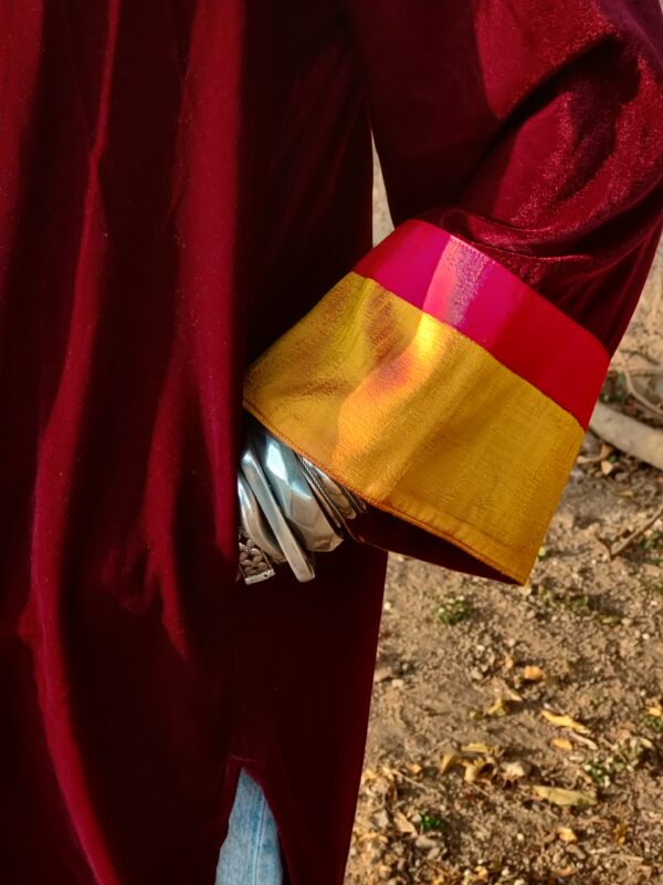 This Kashmiri-inspired Pheran is crafted from Premium Velvet, featuring a relaxed, anti-fit silhouette designed for maximum comfort. Adorned with an elegant notched neckline and stylish Bell Sleeves with 100% Pure Silk sleeve detailing that enhances its overall elegance. Thoughtfully designed with two deep pockets for functionality.
