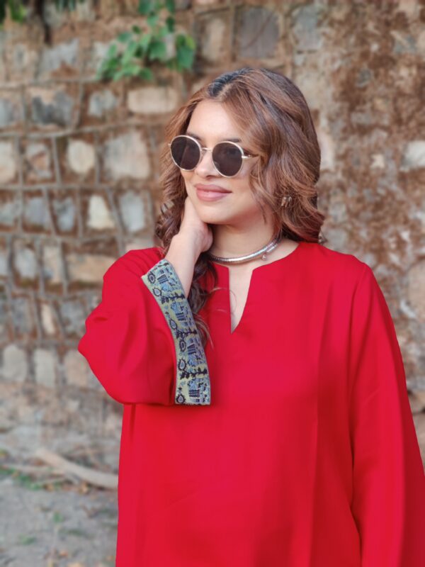 Inspired by traditional Kashmiri Pherans, this co-ord set features exquisitely embroidered bell sleeves and an elegant, timeless silhouette.